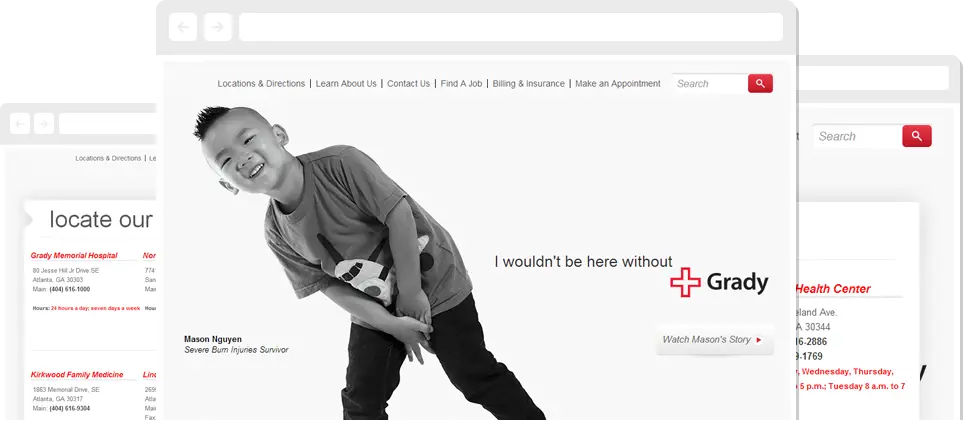 Opened in 1892, Grady Health System grew up with Atlanta. Perhaps the most known two thing about Grady are their trauma and emergency centers. 2013 was a year that Grady planned an important refresh of their brand, coordinating their media campaign with a brand new website: more comprehensive, with tools to help patients access their services morea easily and with an accent on user experience.